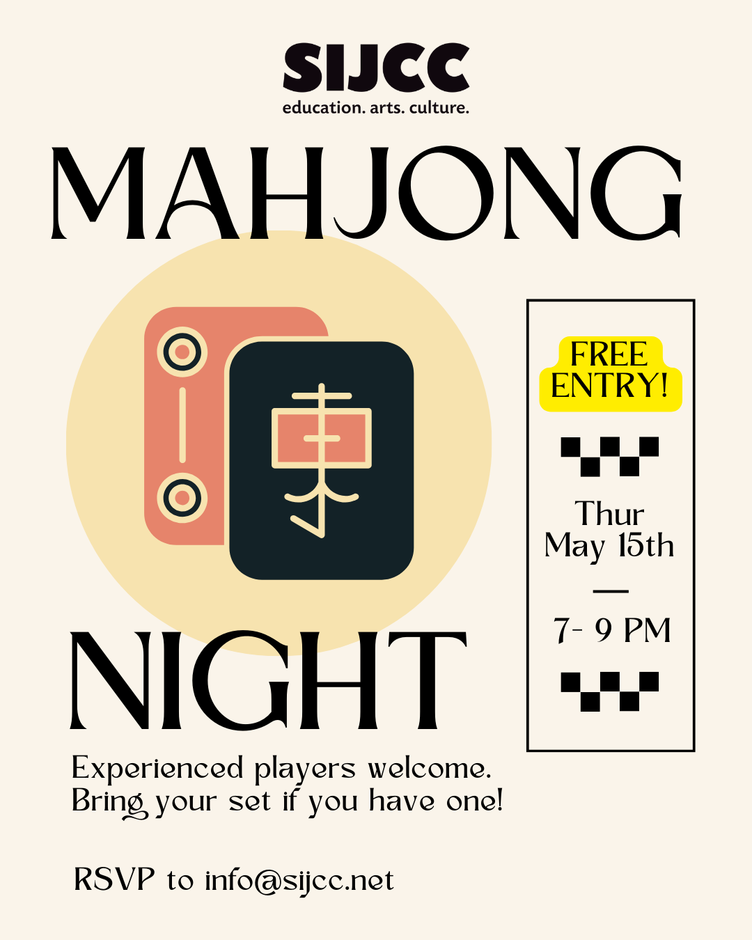 Calling all Mahjong players! Come join us at SIJCC for a laid-back night of tiles, strategy, and community. Whether you're a regular player or just brushing up your game, we’d love to have you at the table. If you’ve got a Mahjong set at home, bring it along to help us keep more games going. Let’s shuffle, build walls, and play a few great rounds together!